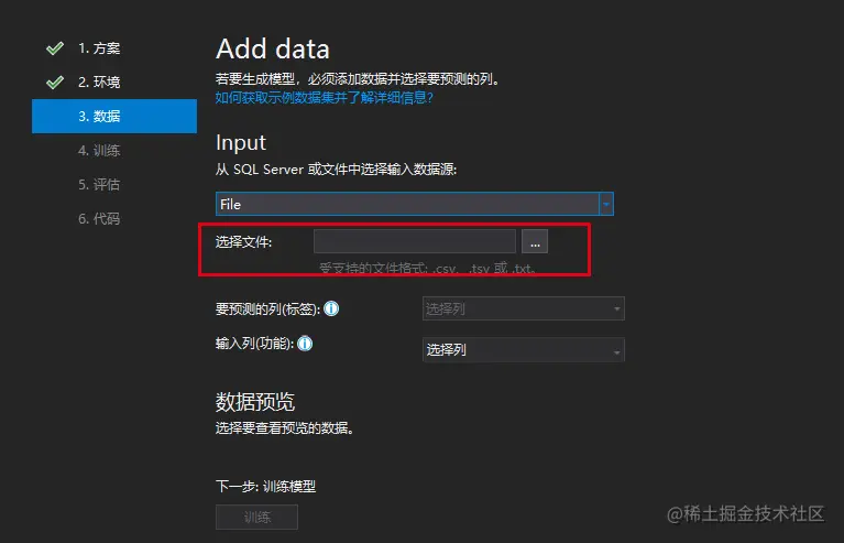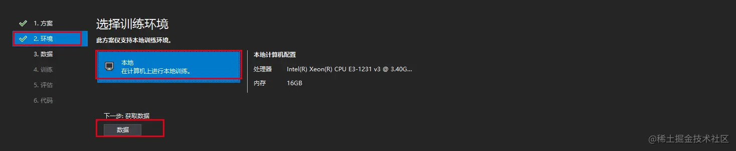 在环境页面,选择本地训练,然后点击下一步获取数据,如下图: