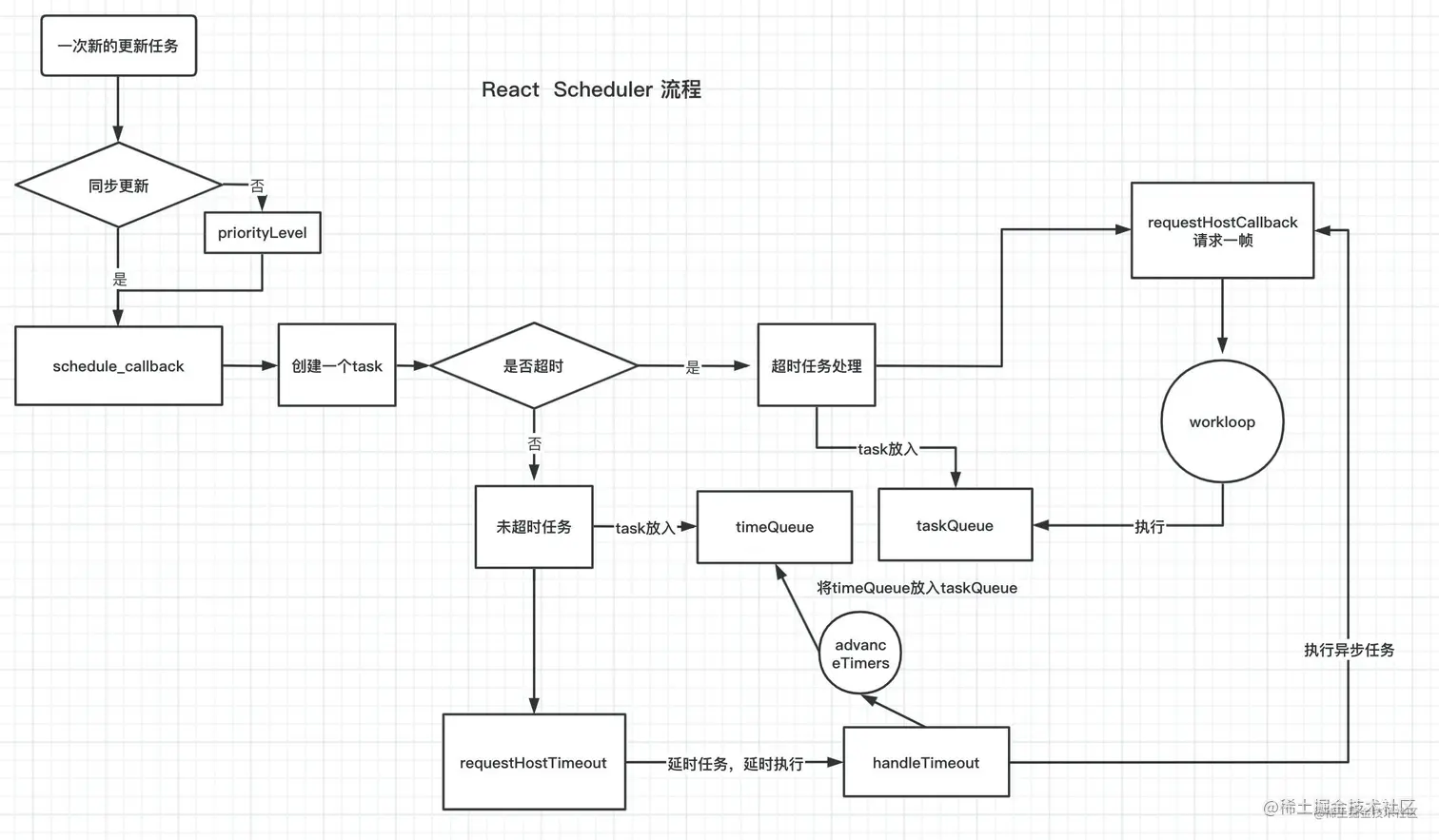 React 似乎无法打破从 root 开始‘找不同’的命运,但是还是要解决浏览器卡顿问题,那怎么办,解铃还须系铃人,既然更新过程阻塞了浏览器的绘制,那么把 React 的更新,交给浏览器自己控制不就可以了吗,如果浏览器有绘制任务那么执行绘制任务,在空闲时间执行更新任务,就能解决卡顿问题了。与 vue 更快的响应,更精确的更新范围,React 选择更好的用户体验。而今天即将讲的调度( Scheduler )就是具体的实现方式。