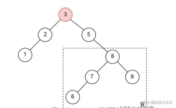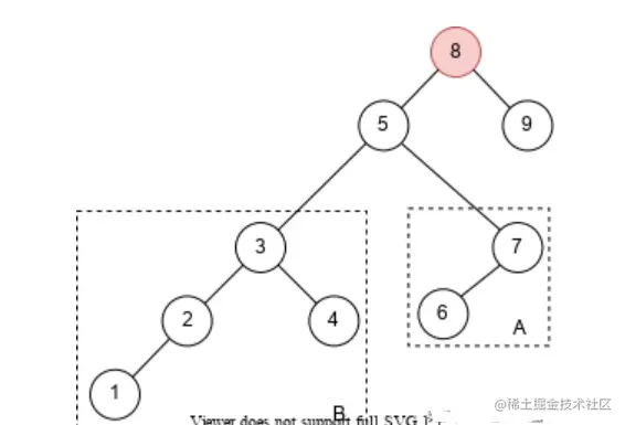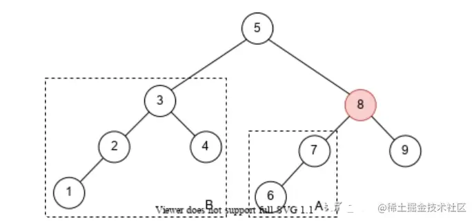 还是使用原始版本。这次根节点 5 的左子树为 B,右节点 8 为转轴,节点 8 的左子树为 A(转轴旋转方向的内侧)。