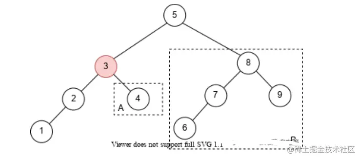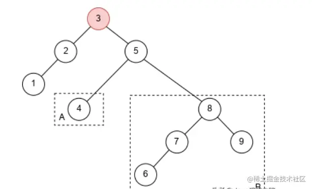 为讨论方便,把旋转前 3 的右子树称为 A,5 的右子树称为 B。如下图所示: