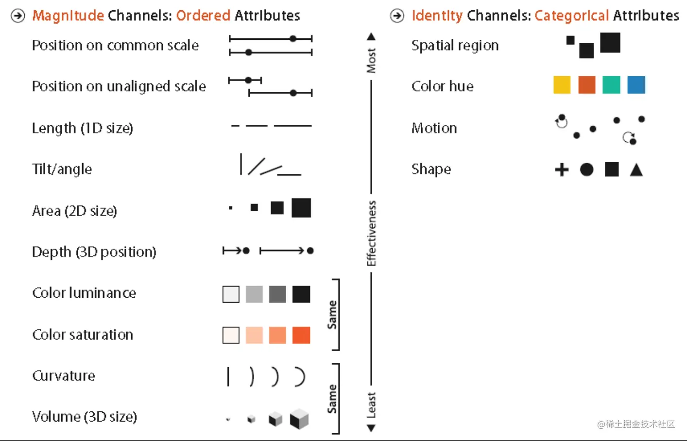 - 位置通道是最为精确的,其次是长度、角度、面积、深度、色温、饱和度、曲率、最后是体积。