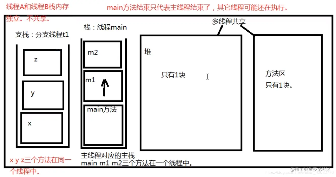 进程是一个应用程序,线程是一个进程中的执行场景/执行单元。一个进程可以启动多个线程。在java语言中对于两个线程A和B,堆内存和方法区内存共享。但是栈内存独立,一个线程一个栈。 在使用了多线程机制之后,main()方法结束了,只是主线程结束了,主栈空了,但其他线程不一定结束,其他栈(线程)可能还在压栈弹栈。
