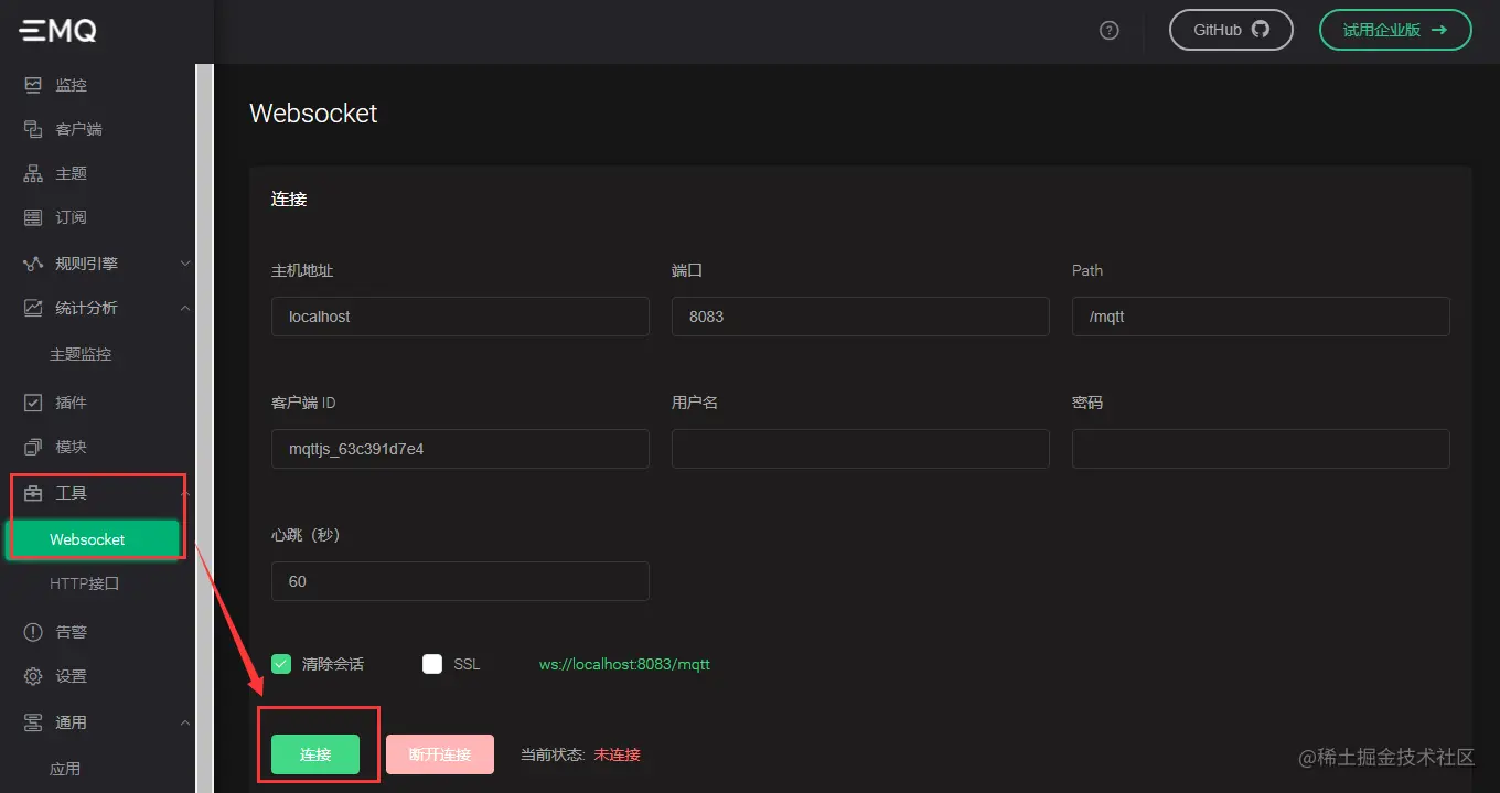 http://127.0.0.1:18083/,账号admin,密码public,进入管理界面 - 工具 - Websocket,选择连接