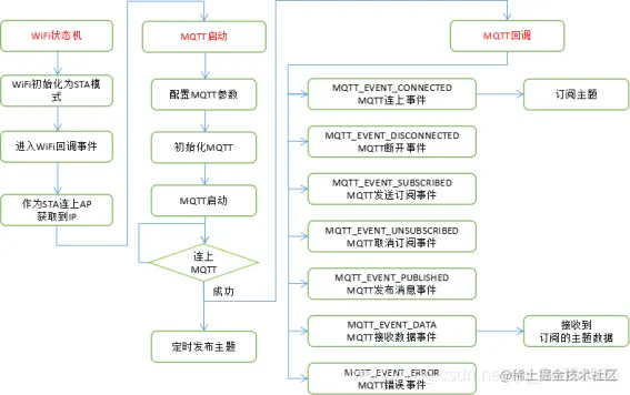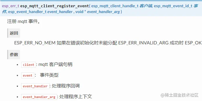 所以我们要注册一个 MQTT 事件,填入 MQTT 事件处理函数 mqtt_event_handler(),