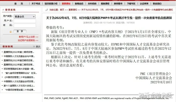 PMP官网8月10日发布:关于为2022年6月、7月、8月中国大陆地区PMP®考试未通过考生统一提供一次免费重考机会的通知