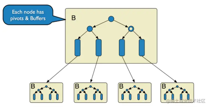 TokuDB 底层存储结构为 Fractal Tree,Fractal Tree 的结构与 B+树有些类似, 在 Fractal Tree中, 每一个 child 指针除了需要指向一个 child节点外,还会带有一个 Message Buffer ,这个Message Buffer 是一个 FIFO 的队列,用来缓存更新操作。例如,一次插入操作只需要落在某节点的 Message Buffer 就可以马上返回了,并不需要搜索到叶子节点。这些缓存的更新会在查询时或后台异步合并应用到对应的节点中