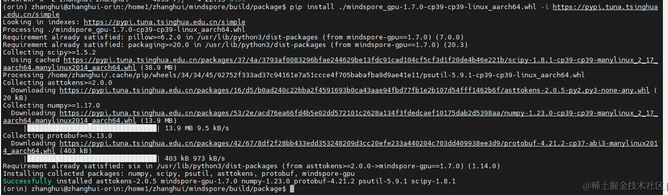pip install ./mindspore_gpu-1.7.0-cp39-cp39-linux_aarch64.whl -i pypi.tuna.tsinghua.edu.cn/simple\