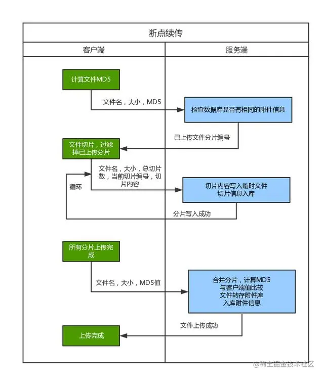 断点续传其实是利用分片上传的特性,上次上传中断时,已经有部分分片已上传到服务端,这部分就可以不用重复上传了