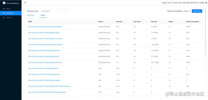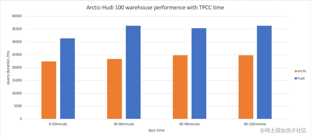 性能也是 Arctic 非常关注的点,尤其在读时合并方面,我们做了大量工作,面向流式湖仓性能测试工具我们做出了针对性的方案,这块的工作今年晚些时候我们也会向大家开放,简单来说,我们使用 HTAP 的 chbenchmark 思路,tpcc 持续写入的数据通过 FlinkCDC 流式写入 arctic 和 hudi,benchmark 的测试结果用 tpch 来衡量,测试的对象是 olap 场景下的读时合并性能,arctic 和 hudi 的数据新鲜度都设置为 1 分钟,目前 arctic 开源版本测试结果如下(数值越小性能越好):