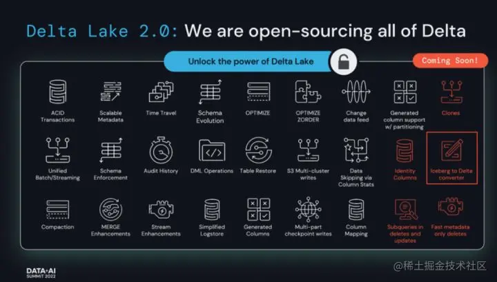 虽然 Databricks 的工程师反复强调性能测试来自第三方 Databeans,并且他们没有主动要求 Databeans 做这项测试,但如果全程看完 delta2.0 发布会,会发现在 delta2.0 即将开放的 key feature 中,特别列出了 Iceberg 到 Delta 的转换功能,并且官方着重讲到了 Adobe 从 Iceberg 迁移到 Delta2.0 的实践,这就难免让人浮想联翩了。