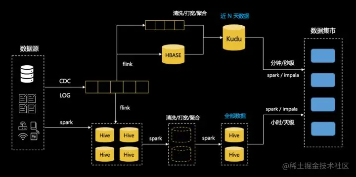 场景中用 Hive 做批表,kafka 做流表,整个离线遵循数据中台和 Dataops 的方法论,实时场景下需要用户构建同步到 hbase 的流计算任务,需要用户实现 join hbase 维表的流计算任务,把数据写到支持实时更新的 kudu 中,最后由业务根据实时和离线的需要选择查询 kudu 表还是 hive 表,在此之前,用户需要分别在数据模型中建表,使用 kudu 的工具建表,并且自己处理两个系统的差异。在这个架构中,用户遭受了割裂的体验,并且需要在上层做很多工作。