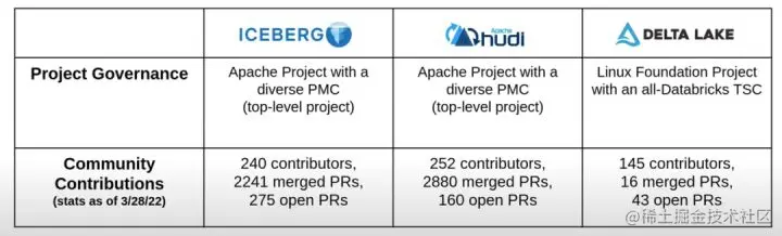 按照 Databricks 的构想,delta1.0 作为 lakehouse 解决方案,可以让数据湖更多,更快地作用于实时和 AI 场景,databricks 提出 delta 架构帮助用户从 lambda 架构中解放出来,核心思想是数据湖既可以跑批,也可以跑流,流计算和批计算的流程和代码可以复用,这样用户没有了维护 lambda 架构的负担,当然计算引擎必须是 spark。遗憾的是 spark streaming 和 struct streaming 在国内用户体量很小,绝大部分用户对 delta1.0 是望梅止渴,对 spark 的深度绑定也一定程度上限制了 delta 社区的发展,给 iceberg 的崛起预埋了伏笔,截止 2022 Q1 社区活跃度的一个对比如下: