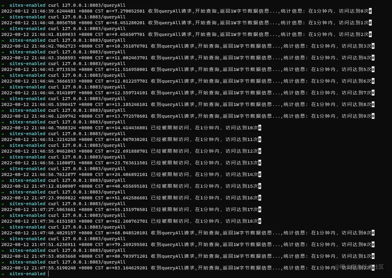 通过上述执行结果图,可以看到,当1分钟内访问次数超过10次后,就被限制访问了,而从第一次访问时间到目前访问时间间隔达到1分钟以上后,限制就被解除了,可见功能已经完成了。