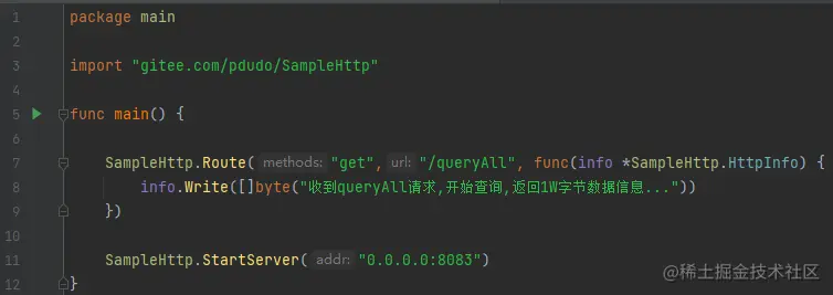 我们先来使用SampleHttp编写一个最简单的web服务器,定义路由queryAll,收到后,假设将返回客户端1w字节的数据信息。
