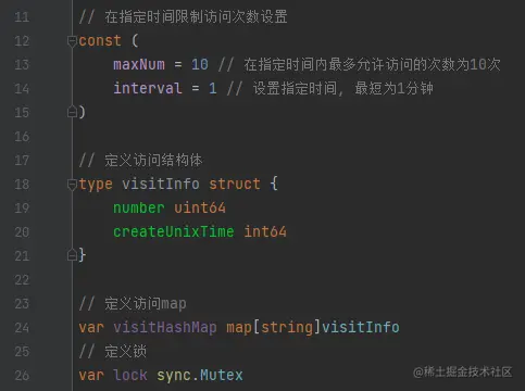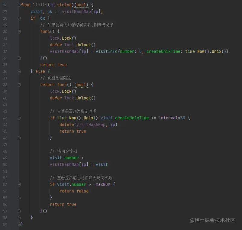 核心存储,我们可以选择go map,其中key为ip,value为结构体,该结构体包含访问次数和创建间戳。