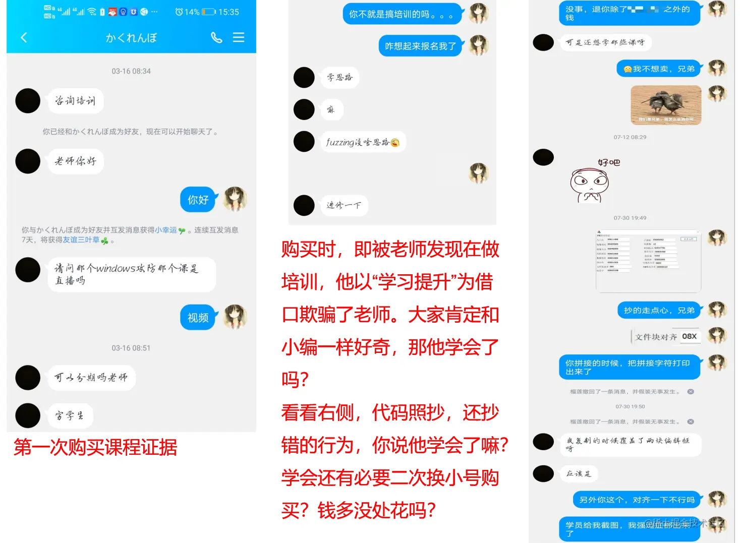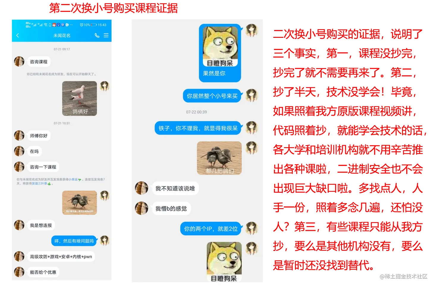 综上所扒,确实有那么少得可怜的几节课,可能疑似为原创(当然,也可能是没有找着受害者)。除此之外,课程大纲、内容均为东拼西凑。这样的一套所谓的“原创”课程,下节、下下节课程有没有着落都是个未知数,课程的完整性、系统性又何从谈起?能带给想好好学习技术的各位什么?是一锅精华?还是一颗咽不下去,吐出来恶心的老鼠屎?显然,以其捉襟见肘的技术水平,和逐字照抄都出错的细致,想必其课程很难是一锅融百家所长的精华。