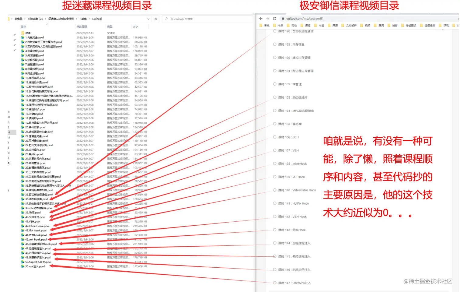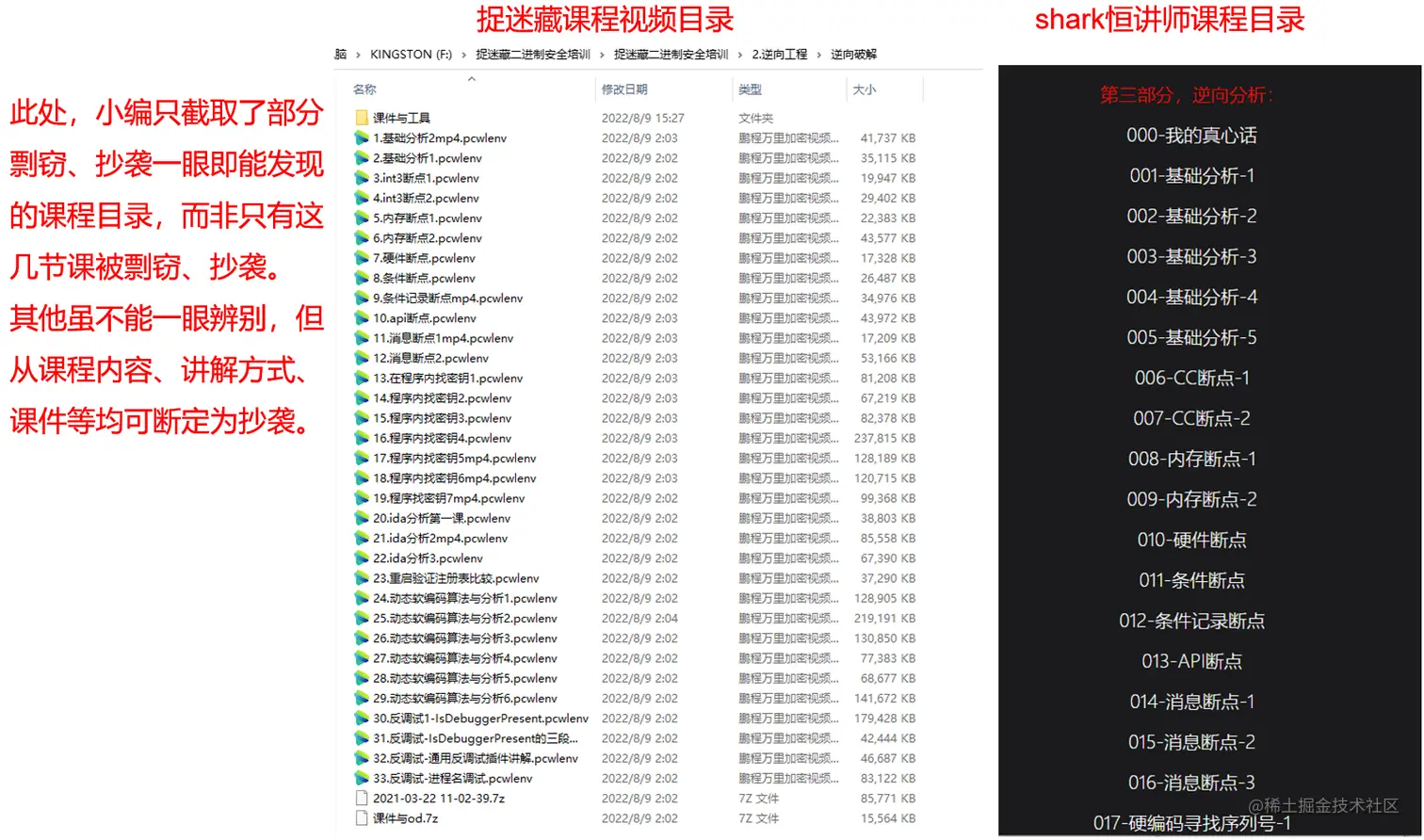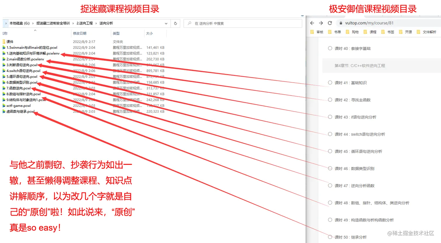 剩下的164节又是什么情况呢?足足有153节是剽窃、抄袭自北京极安御信科技有限公司rkvir讲师的课程,涉及到C++、逆向工程之逆向分析、MFC程序设计、PE结构、系统编程等。虽然,捉迷藏剽窃、抄袭的课程只占到我方(极安御信)现有1160节原创课程很小的一部分(截止计算到写文章时,因有些课程还在持续更新中),但是我方仍认为此次捉迷藏剽窃抄袭事件是极其无耻和恶劣的,并强烈谴责剽窃、抄袭的违法行为!