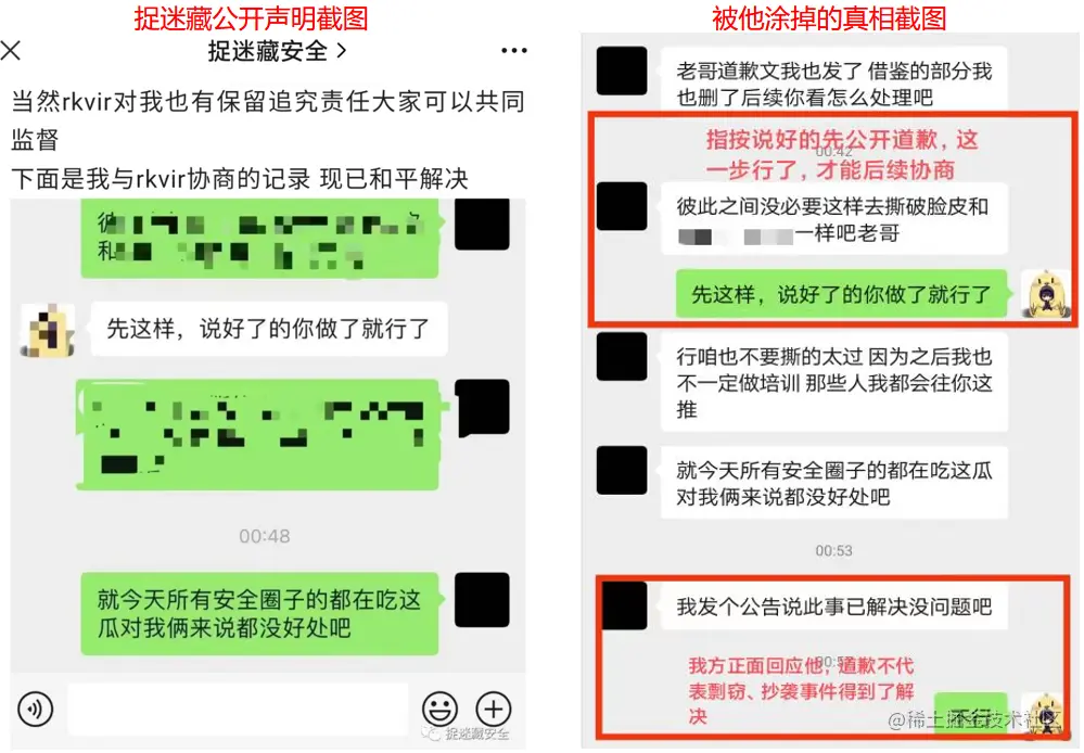 而捉迷藏安全发布公告宣称剽窃、抄袭课程已删,且事件得到和平解决的截图为有意的断章取义,是其为安抚欺骗学员,继续招生的谎言。望网络安全圈内各位同仁周知!