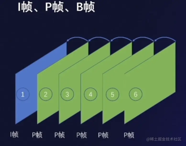 P帧:前面的I帧解码后才解码,依赖于I帧(记录的是与前一帧的差别)