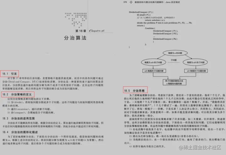 首先通过对一个简单理论的讨论,初步理解贪婪思想。以下棋为例,每一步的决策都需要考虑对后续棋局的影响。而在网球(或排球)比赛中,选手的行为仅取决于当前的状况,选择当下最为正确的动作,而不关心后续的影响。这说明在某些情况下选择当下最佳行为的决策,可以得到一个最优解(贪婪),但并非所有情况都如此,贪婪策略适用于上述第二类问题。 第18章分治算法