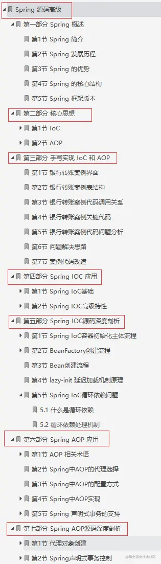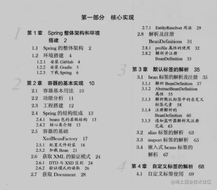 本文档从核心实现和企业应用两个方面,由浅入深、由易到难地对Spring源码展开了系统的讲解,包括Spring 的设计理念和整体架构、容器的基本实现、默认标签的解析、自定义标签的解析、bean的加载、容器的功能扩展、AOP、数据库连接JDBC、整合MyBatis、事务、SpringMVC、远程服务、Spring 消息服务等内容。由于篇幅限制就只展示目录了~