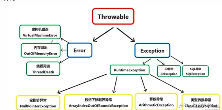 首先异常的父类是 Throwable ,然后两个子类, Error 和 Exception 。其中Error(错误)是JVM中系统的异常,这些错误是不可控的,一般程序出现死循环或者线程死锁之类会导致出现此类错误。