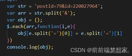 字符串转换成对象的操作 代码跑不动 2022-08-12 87 阅读1分钟 前言: 在实际项目中,原始拿到的数据不一定是我们想要的类型,我们就需要对它进行处理,今天带来的是字符串转换成对象的操作案例。 问题描述 将字符串 postId=79&id=220027964 转换成 对象 形式。 "postId=79&id=220027964" => {postId:79,id:220027964} 方案: 编辑 亲测有效,即使字符串参数增加,也能实现效果。
