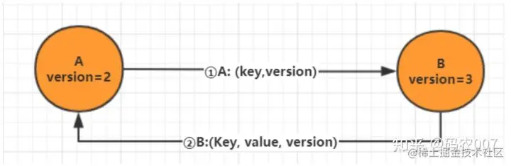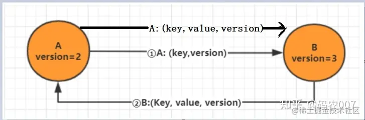 节点 A 将数据 (key,value,version) 及对应的版本号推送给 B 节点,B 节点更新A中比自己新的数据