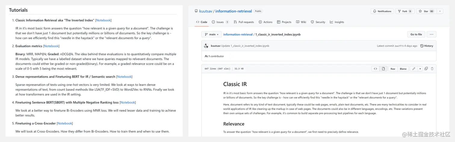 信息检索(Information Retrieval)是计算机系统响应用户对特定主题基于文本的信息查询过程,是自然语言处理领域最早且仍然最重要的问题之一。Repo 包含了当前可用于信息检索的技术教程,并拓展到了模型技术/指标、近似最近邻技术和矢量数据库等。