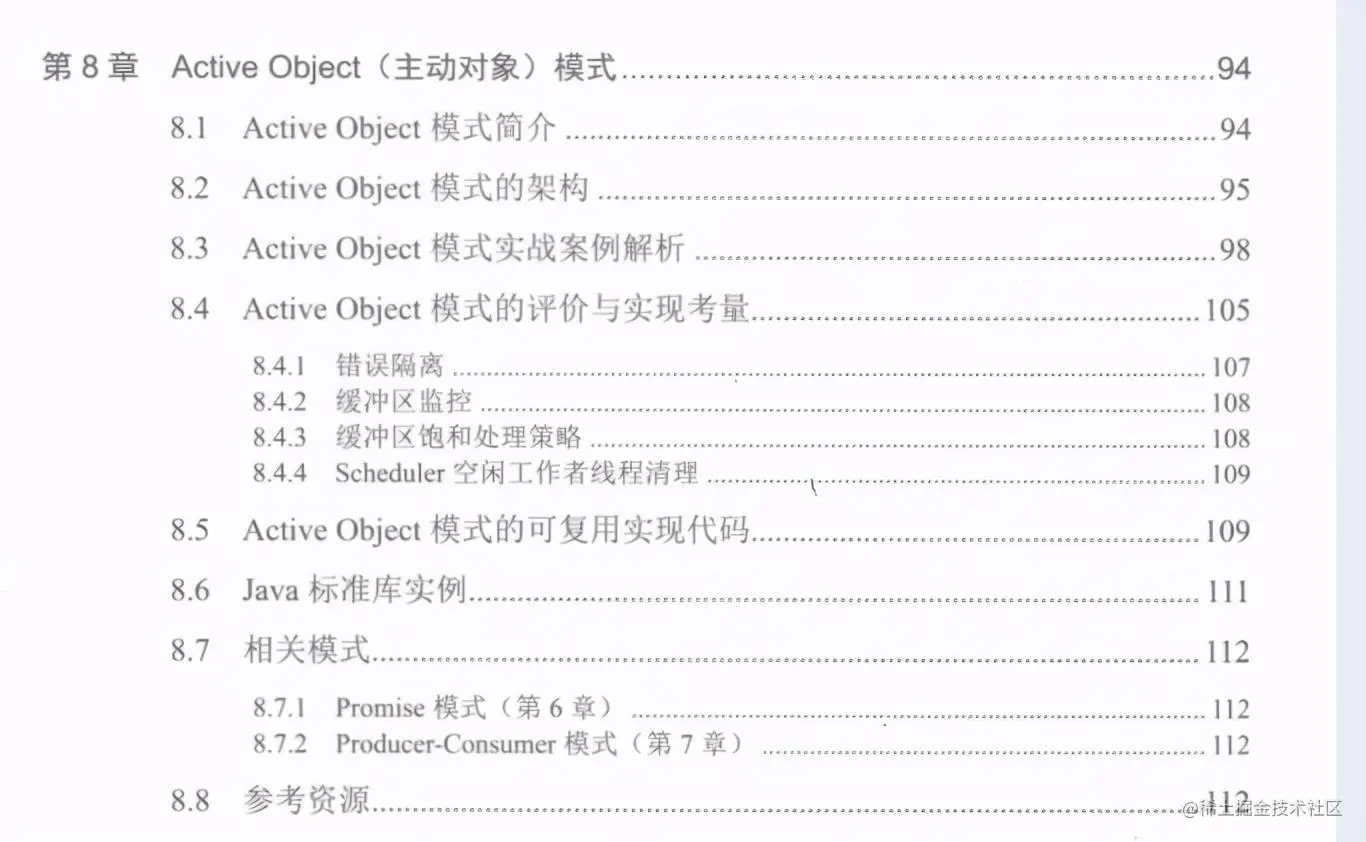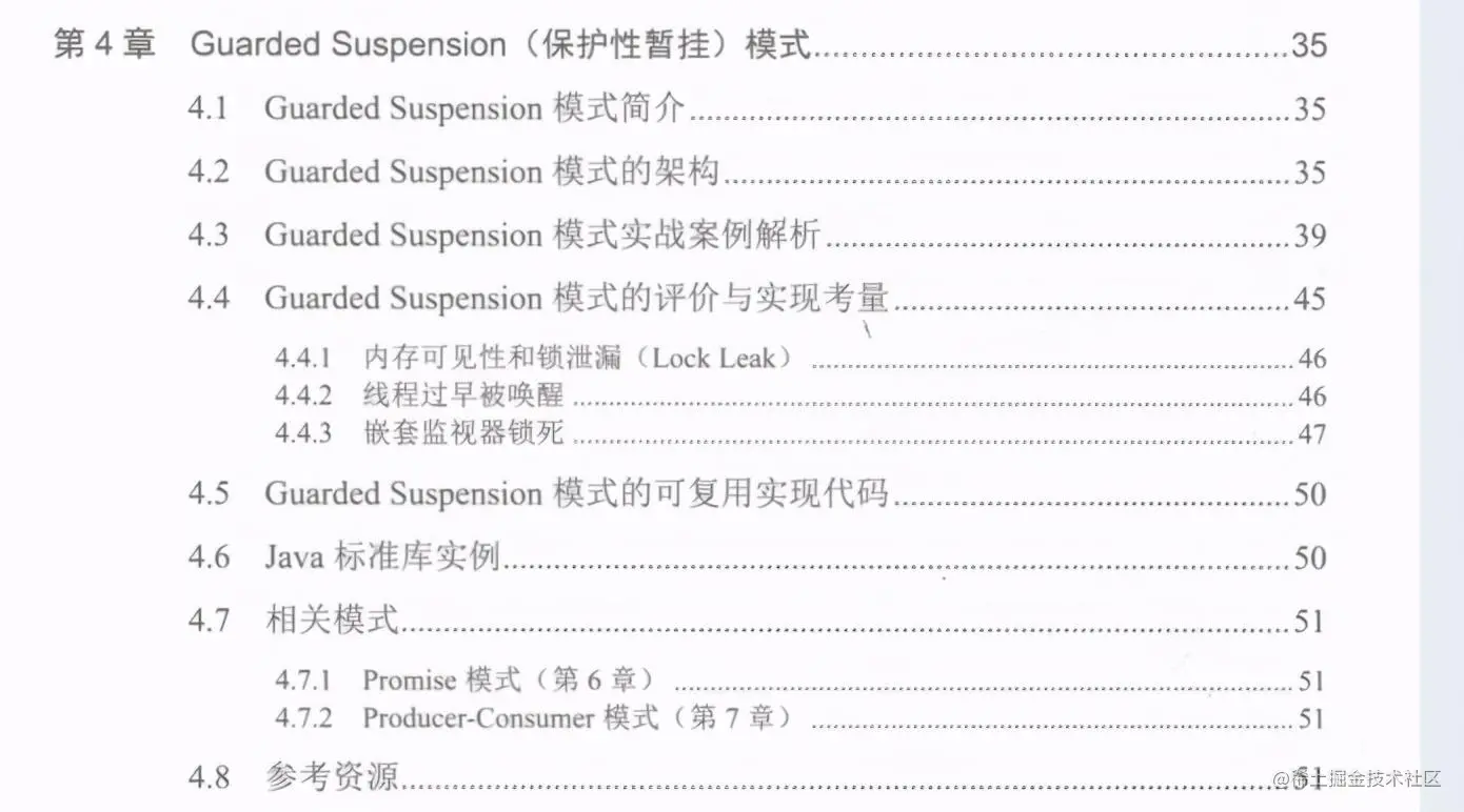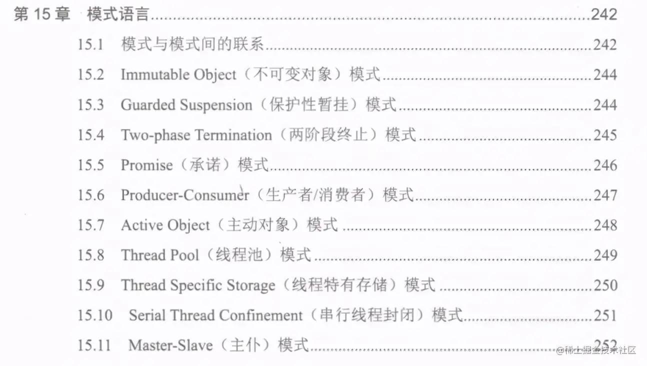 设计模式相当于软件开发领域的“三十六计”,它为特定背景下反复出现的问题提供了- -般性解决方案。多线程相关的设计模式为我们恰当地使用多线程进行编程并达到提升软件服务质量这一目的提供了指引和参考。当然,设计模式不是菜谱。即便是菜谱,我们也不能指望照着菜谱做就能做出一道美味可口的菜肴,但我们又不能因此而否认菜谱存在的价值。