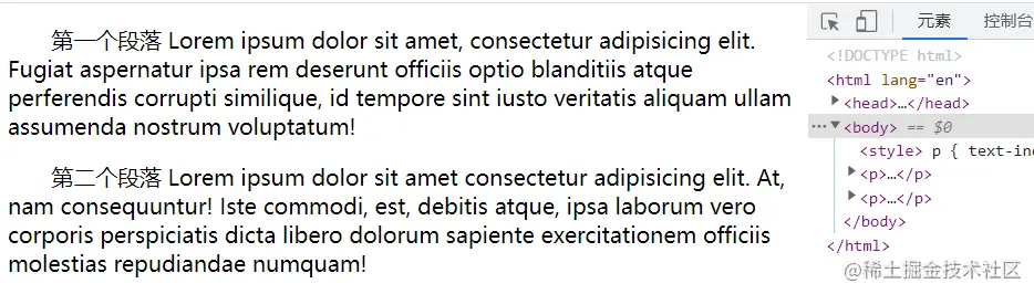 让段落首行缩进两个字,需要搭配 CSS 来完成,因为 HTML 相当于是 页面的骨架,CSS 描述的是页面的样式。加一个 style 标签就可以了: