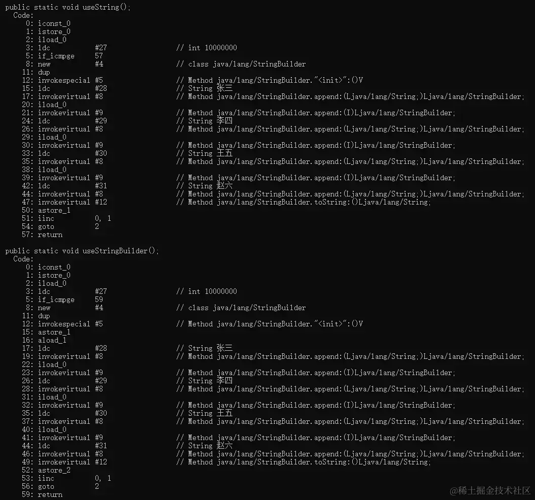 使用 javap -c StringTest.class 反编译查看两个方法编译后的文件: