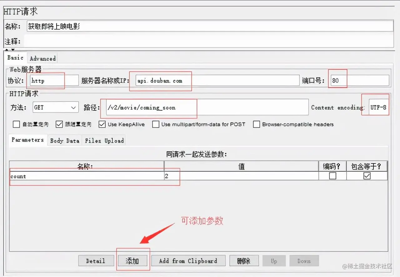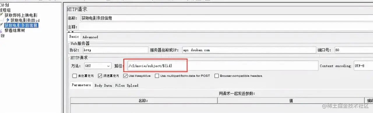 2、添加取样器HTTP请求获取电影条目信息及参数使用