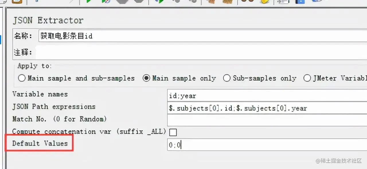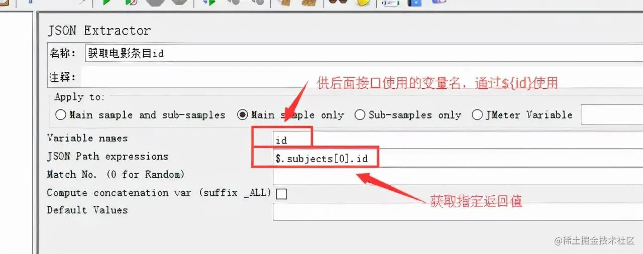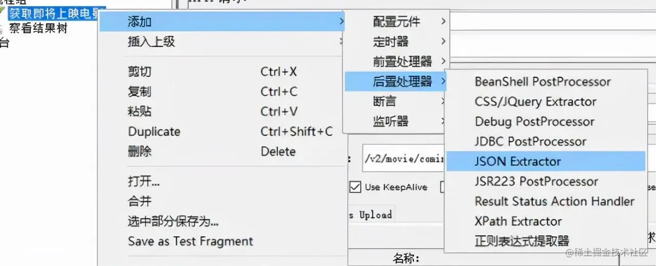 操作:将鼠标放置“获取即将上映电影”的HTTP请求上,并按右键 -> 添加 -> 后置处理器 -> JSON Extractor -> 填入变量名等信息
