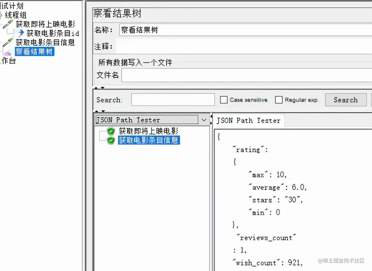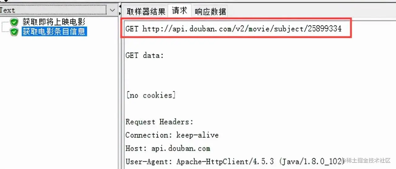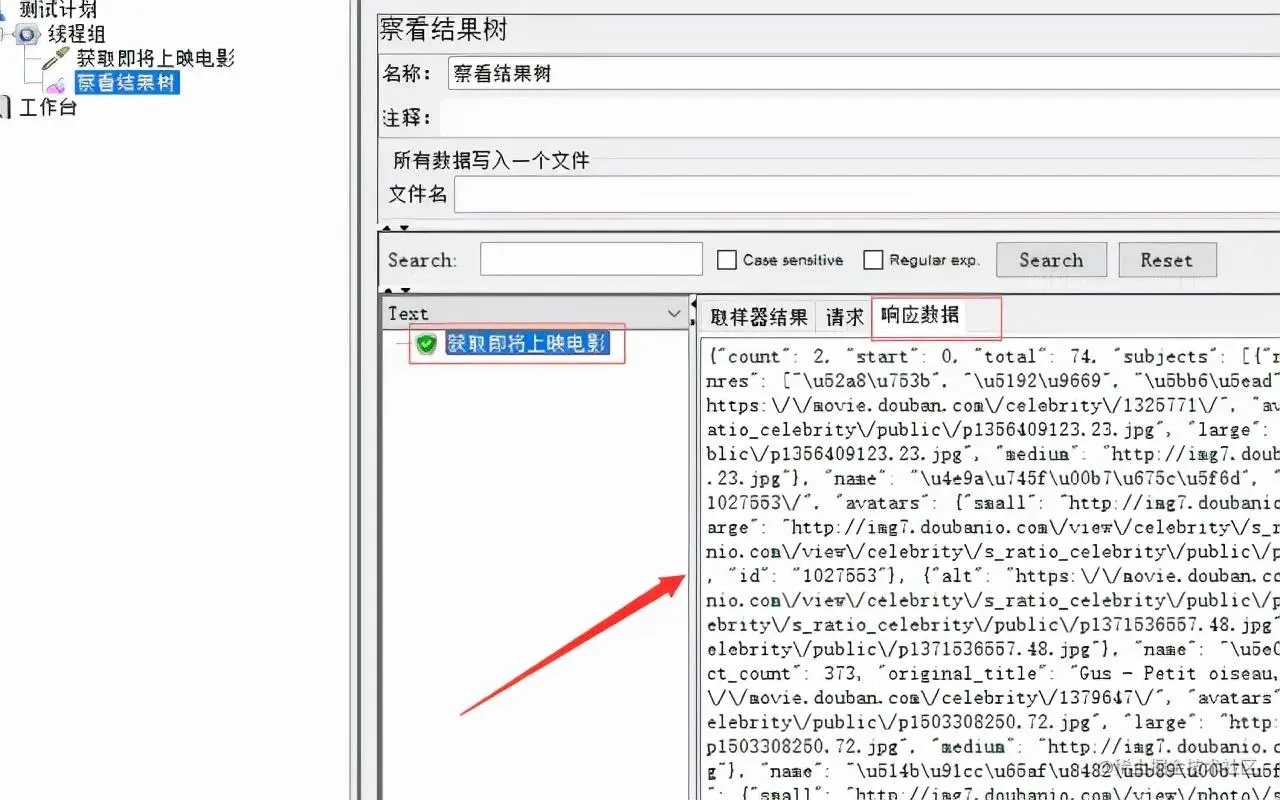 在“察看结果树”中可以看到,获取电影条目信息的HTTP请求中,请求参数正确。同时也得要正确地响应参数。