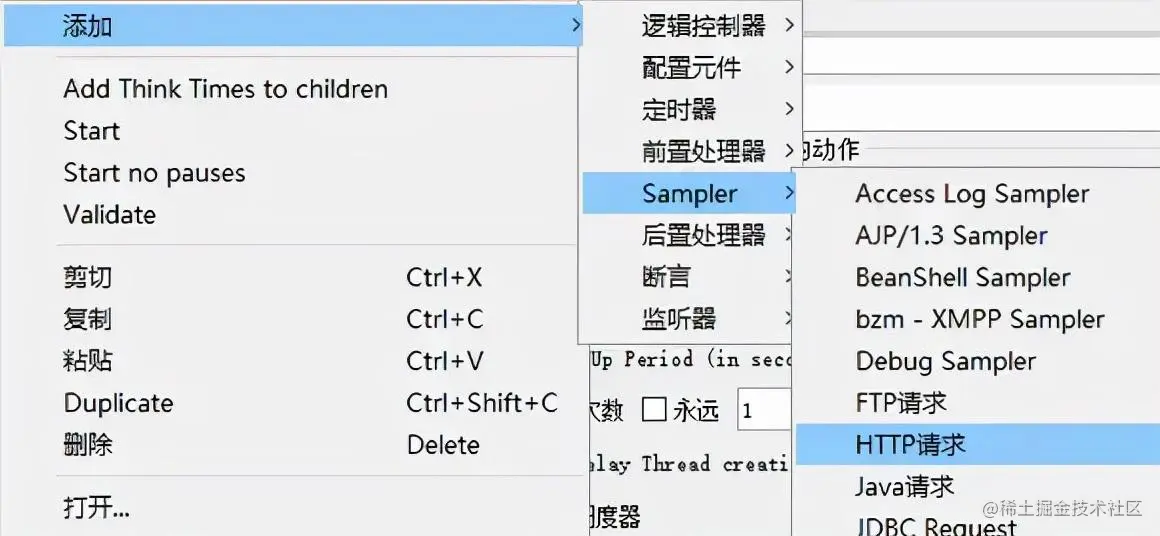 操作:鼠标右键线程组 -> 添加 -> Sampler -> HTTP请求 -> 填写请求参数