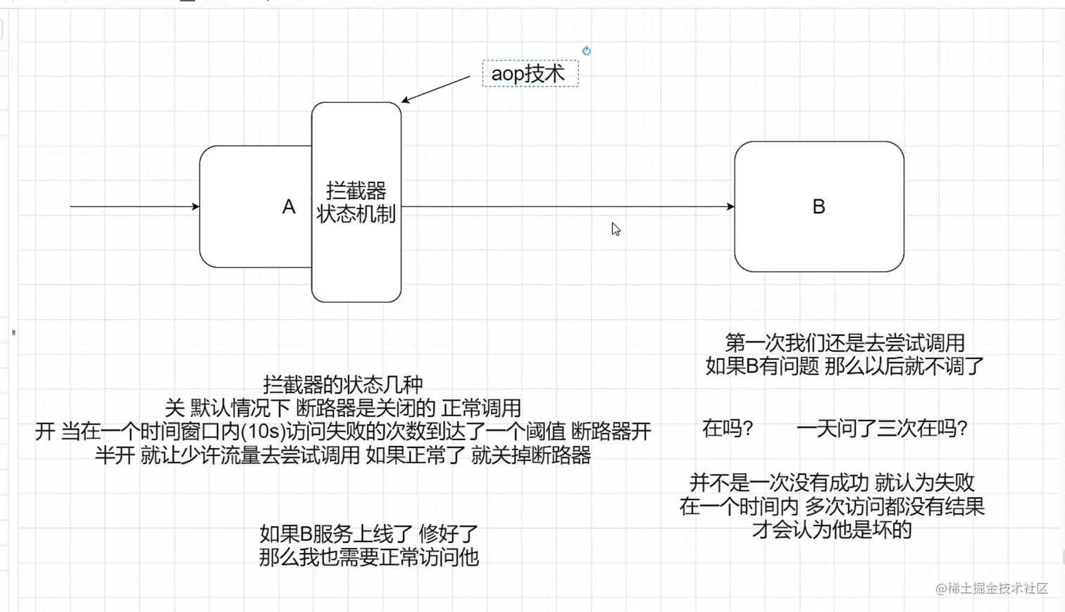 熔断器,也叫断路器。(正常情况下,断路器是关的,只有出现了问题才会打开)用来保护微服务不雪崩的方法,思想上和课程内容中之前画的拦截器是一样的。
