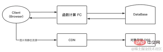 当然, 从原始的传统的 php web 应用完全迁移到 Serverless 形态的函数计算平台, 某些场景可能需要考虑数据持久化问题, 因为函数计算是无状态的, 数据持久化保存可以借助 NAS、Redis 等服务完成,以 NAS 为例,流程图如下: