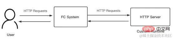 函数计算启动Custom Runtime执行环境时,会默认调用 bootstrap文件(或者您创建函数的时设置的 Args参数)启动您自定义的 HTTP Server, 然后这个HTTP Server接管了函数计算系统的所有请求,即您所有的函数调用请求。