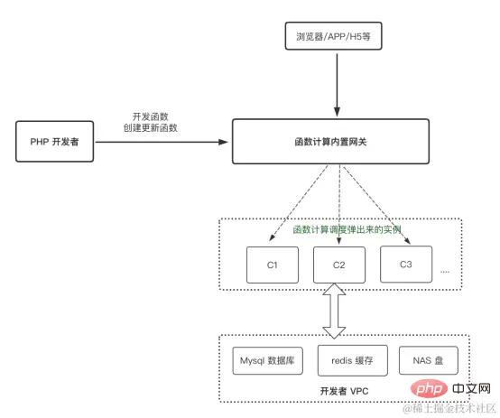 所以, 使用函数计算这个 Serverless 产品和传统的 PHP 开发相结合后, 您再也不用考虑负载均衡的事情, 不用考虑扩缩容的事情, 不用管理机器、不用担心宕机的事情等等, 只需要安安心心把业务代码开发好即可。