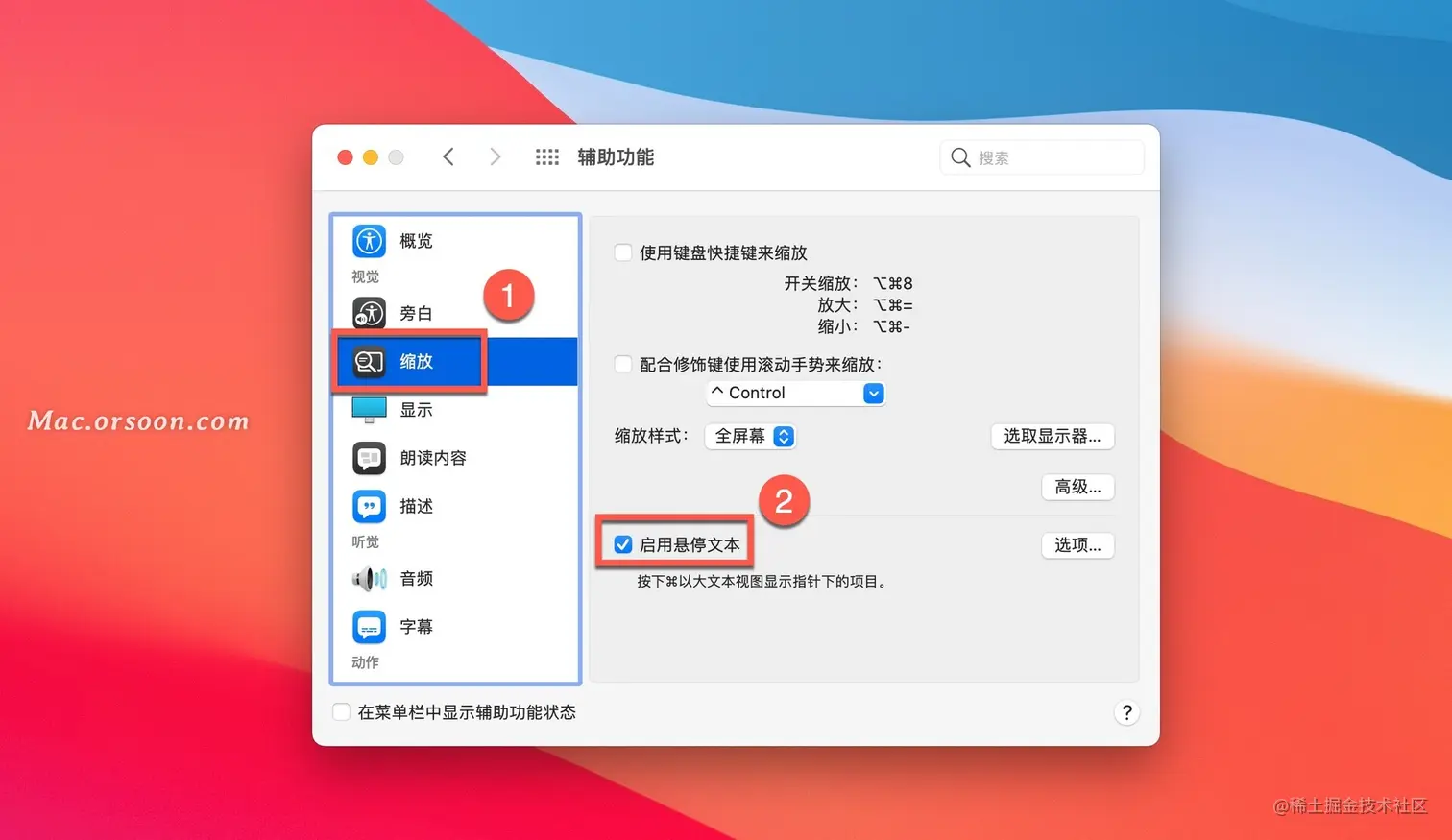 如何开启MacOS的悬停文本功能?在 Mac 上启用“悬停文本”后,您可以将指针移到屏幕上内容(例如文本、输入栏、菜单项或按钮)的上方,在单独的窗口中以高分辨率显示项目的放大版本。