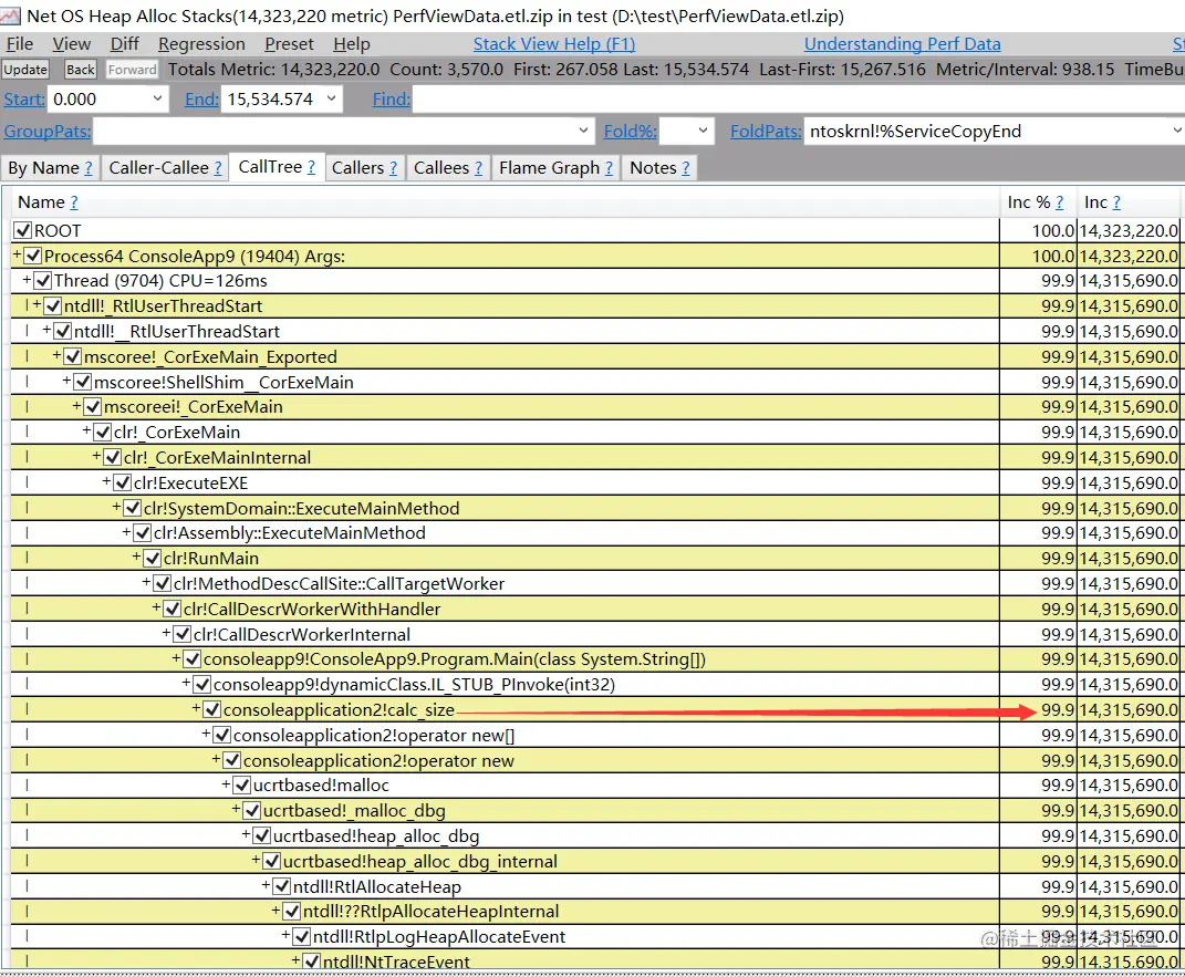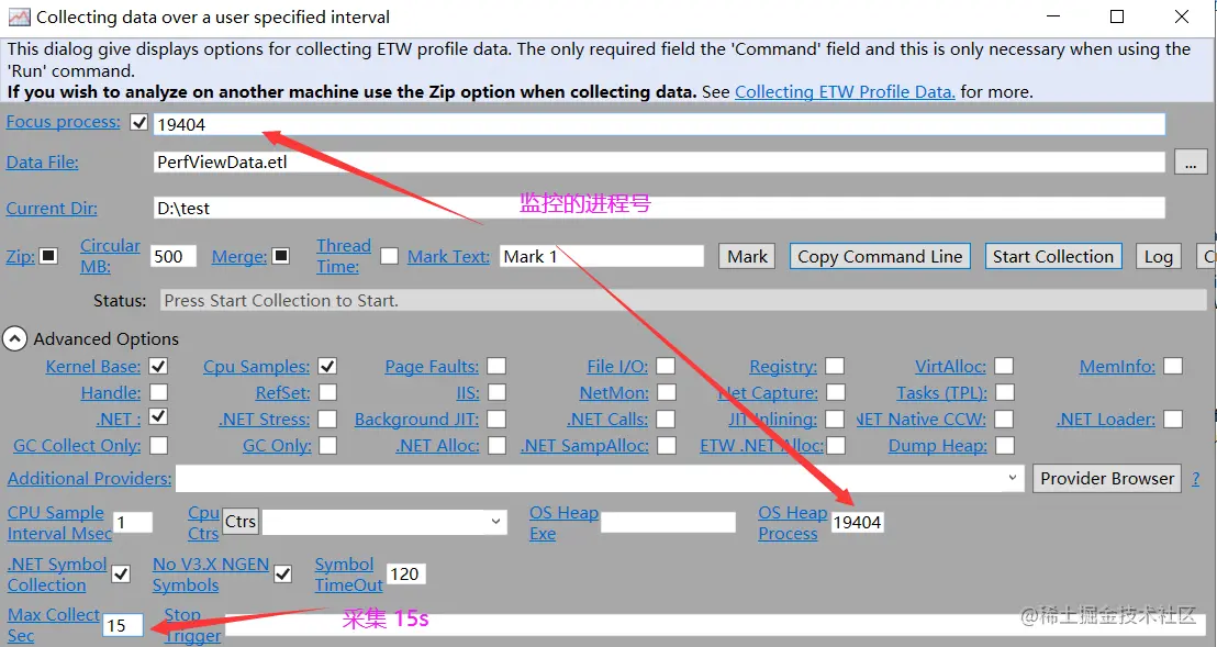接下来把程序跑起来,再打开 Perfview,在 OS Heap Process 输入框填入进程号19404,监控 15s然后 Start Collection即可,这么做的目的时拦截 HeapAlloc 和 HeapFree 方法,截图如下: