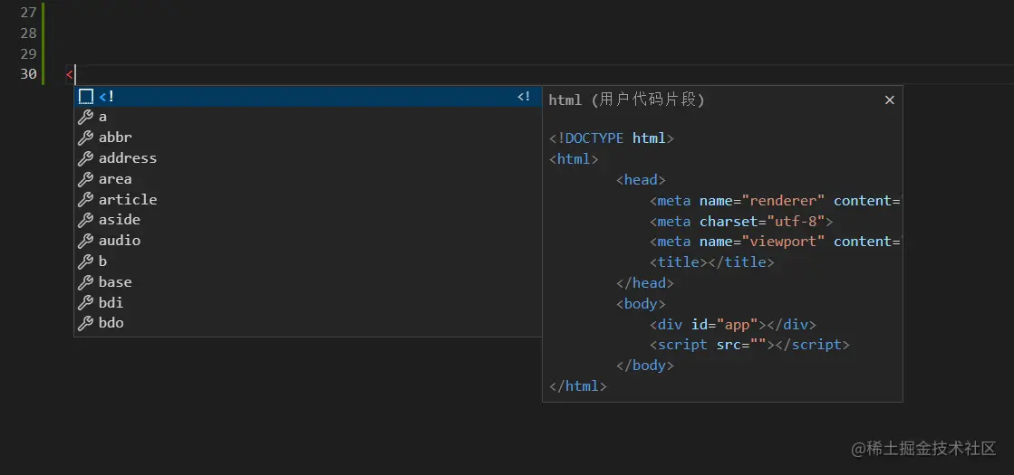 html文件,输入<!出现右边的代码片段,按回车自动生成代码,光标会自动聚焦到title的位置,输完title按回车光标去到script的src引号处(有没有很方便)