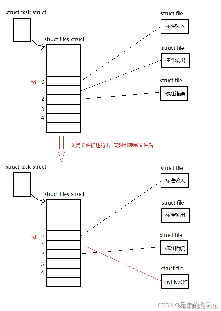 当我们接着向标准输出打印内容时,根据文件描述符分配规则,这时候通过文件描述符1就找到的不是标准输出的struct file,而是创建的新文件的struct file,,这时候再写内容时,就变成了向myfile的文件里写内容了。