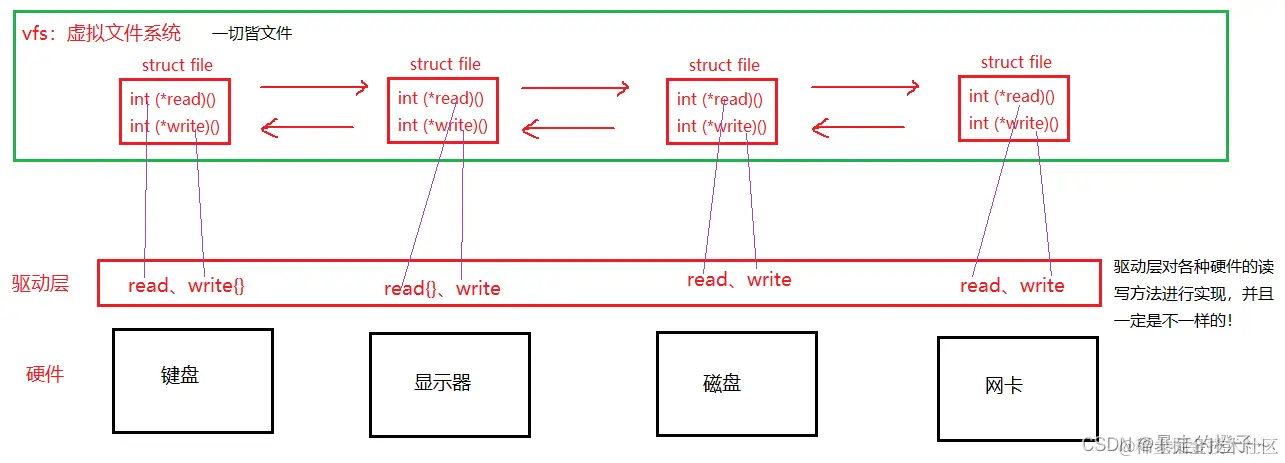 文件在系统层面有一个vfs(虚拟文件系统),里面包含了每一个文件的struct file结构体,它里面有一批函数指针,这批函数指针帮我们指向底层方法的。在vfs看待(统一视角看待文件读写),一切皆文件。(通过fd来找到对应的struct file)。