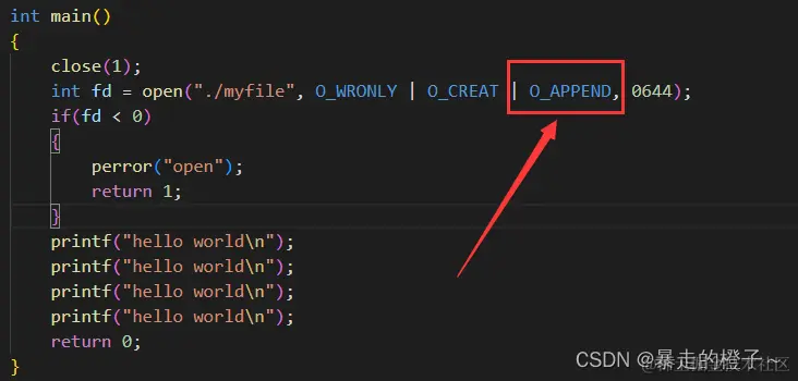 我们要实现追加重定向的功能,也很简单,就是在传flags参数时,或上O_APPEND,就表示追加字符串的意思: