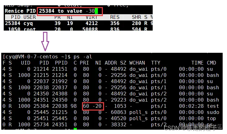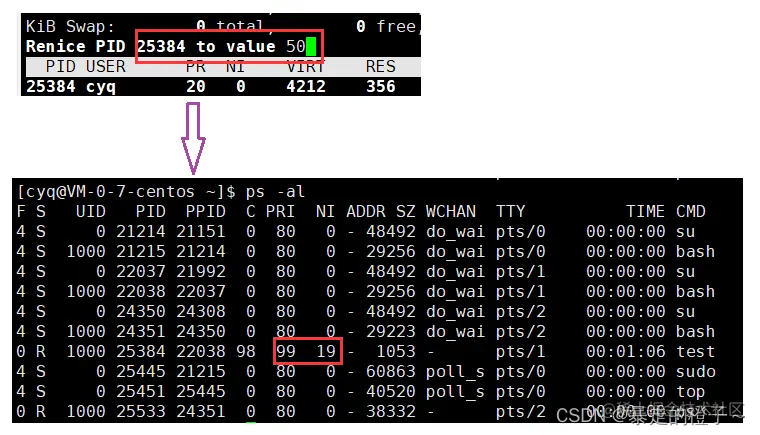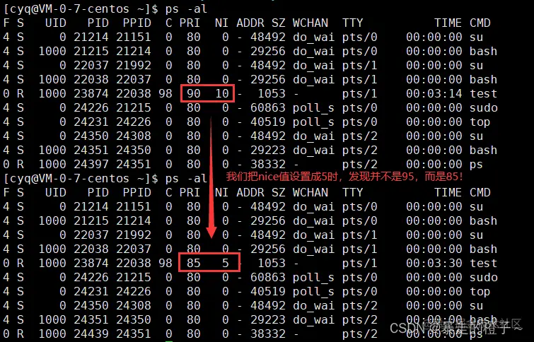 实际上,我们要想修改优先级,用直接修改PRI的方式也是可以的,但是有了nice值之后,我们可以更加直观的看出进程优先级PRI修改前后值变化幅度(nice的大小正负就可以反应出来)。