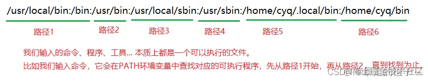 这里的搜索路径,是以冒号 ****: 为每个路径的分隔符,我们输入指令时,系统默认会到PATH环境变量中搜索,从第一个路径开始,直到在某个路径找到位置。