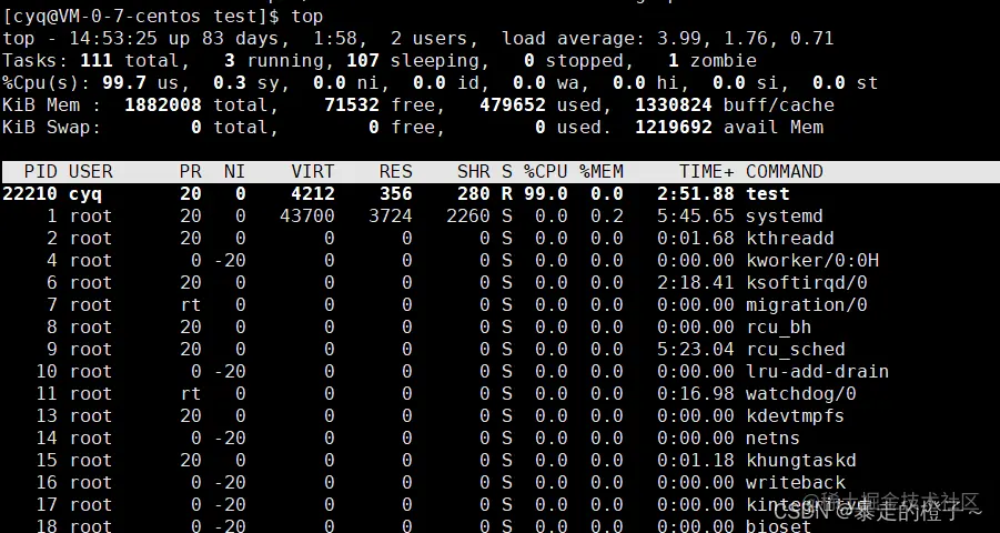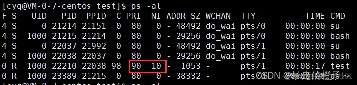 我们这时候发现,该22210进程PRI就被修改成了90。PRI(new) = 80 + 10 = 90。