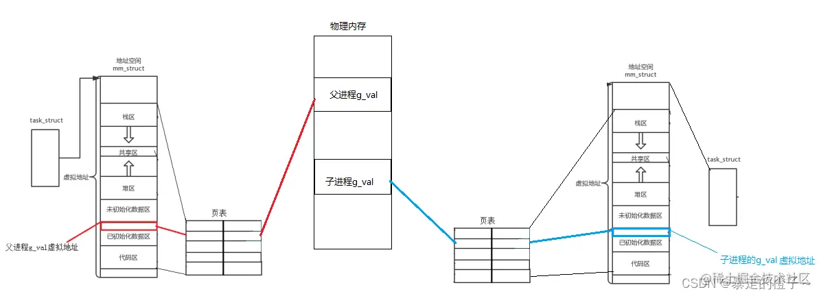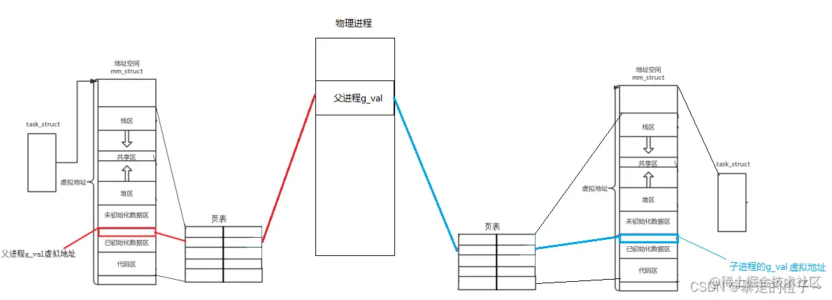 最后我们就能解释最开始的演示现象了,子进程继承了父进程的大部分PCB数据,所以g_val的地址也是一样的,当子进程的g_val值被修改后,在物理内存中发生了写时拷贝!虚拟地址中没有变化,所以最后出现了打印变量的地址一样,但是打印出来变量的值不一样的结果。这个打印的地址就是虚拟地址!
